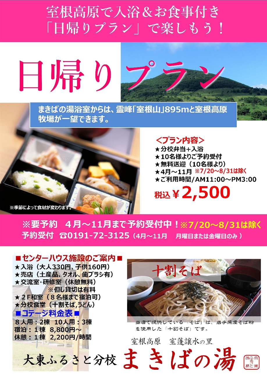 大東ふるさと分校(まきばの湯)お問合せ:0191-72-3125